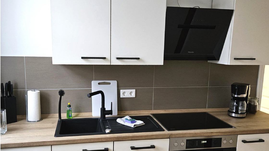 - Küche mit Backofen, Kochfeld, Kühlschrank und Kochzubehör